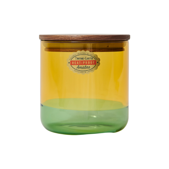シンプルでモダンなデザインがお洒落なキャニスター。耐熱製のカラーガラスとファイヤーキングなどに使われるミルクガラスの組み合わせが特徴的なデザイン。食品の保存容器としてだけではなく、バスルームや玄関の小物入れやフラワーベースとしても使用可能。