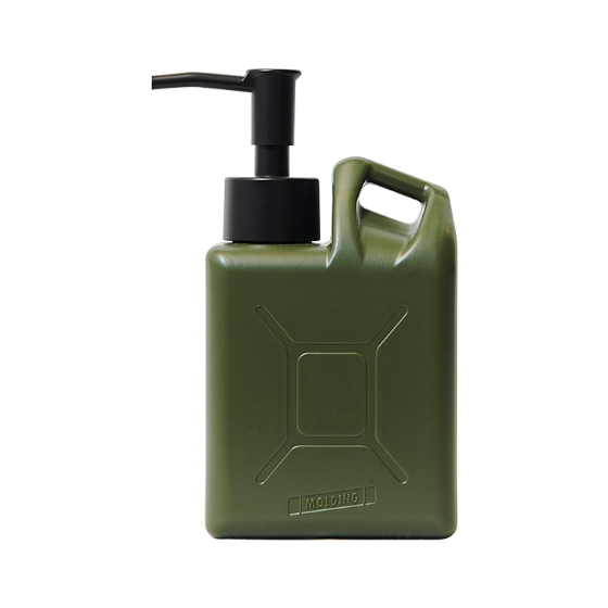 ミリタリーライクなデザインのソープディスペンサー。ジェリカン(銅板を溶接して作られた容器)をモチーフに作られたディスペンサー。場所に困らないコンパクトサイズ。持ち運びに便利なハンドル付き。