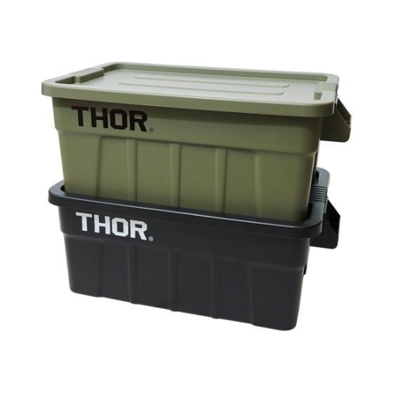 インドアでもアウトドアでも使えるハンドル付きのトートボックス 耐久性が高いので野外でも屋外でも使用できるハンドル付きのトートボックス。53Lと75Lのサイズ違いでもスタッキングでき、ガレージのカー用品からキャンプのギアまで様々な荷物が収納できる。