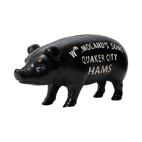 ずっしりとした重量感のある鉄製のピギーバンク。塗装の剥がれなどのアンティーク加工を施し、貯金箱としてだけでなくお部屋のインテリアにマッチする作りです。お腹のネジを取り外して開閉可能です。