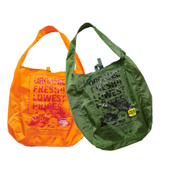 アメリカ、オレゴン州で店舗展開しているという架空のスーパーマーケット「FOOD FORCE OREGON」のオフィシャルエコバッグ。軽量性と耐久性に優れたリップストップ生地を使用。小さくコンパクトになるパッカブル仕様。カラビナ付きで、未使用時はメインのバッグに取り付けて持ち運び可能。